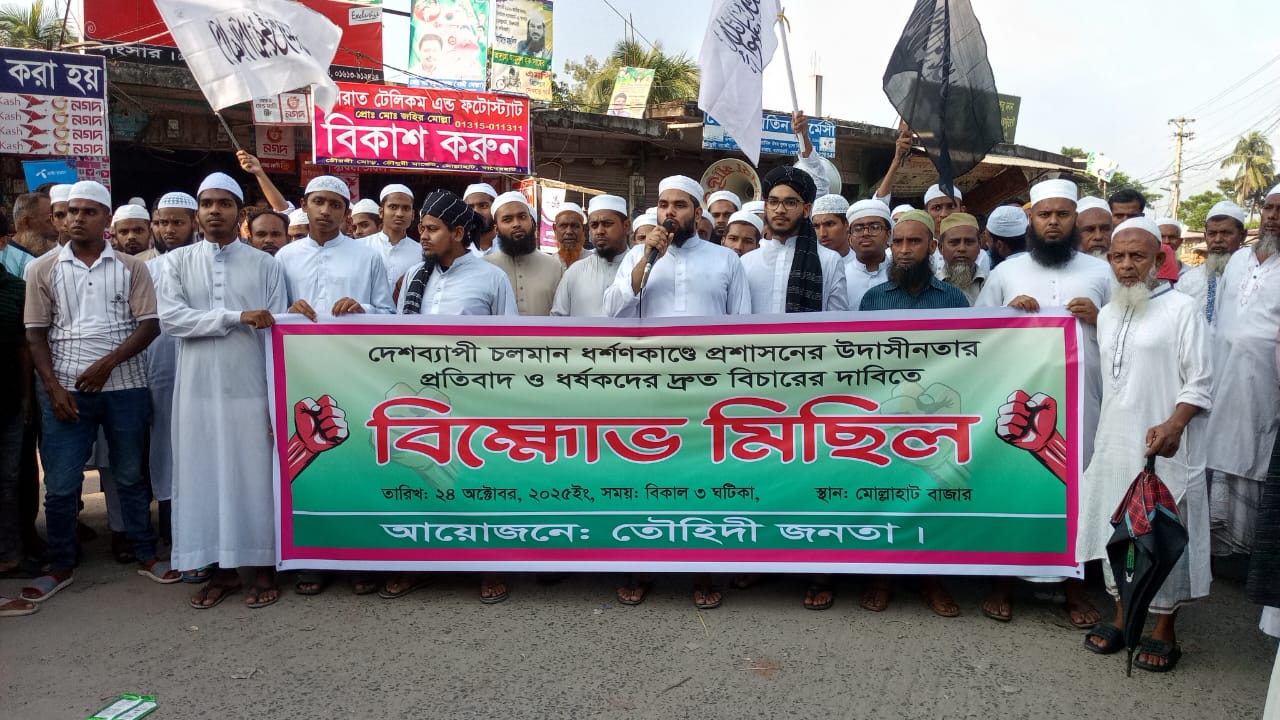 শুক্রবার (২৪ অক্টোবর) বিকাল ৩ টায় তৌহিদি জনতার আয়োজনে উপজেলার প্রধান সড়ক চৌরঙ্গী মোড়ে এ বিক্ষোভ অনুষ্ঠিত হয়। উক্ত বিক্ষোভ মিছিলে বিভিন্ন সামাজিক, ছাত্র ও যুব সংগঠনের সদস্যরা অংশগ্রহণ করেন। বিক্ষোভকারীরা হাতে প্লাকার্ড নিয়ে, ধর্ষণের বিরুদ্ধে একত্রিত হও, ন্যায়বিচার চাই, প্রশাসনের উদাসীনতা বন্ধ করো, হিন্দুত্ববাদী জঙ্গি সংগঠন ইসকন নিষিদ্ধ এই ধরনের স্লোগান দেন।