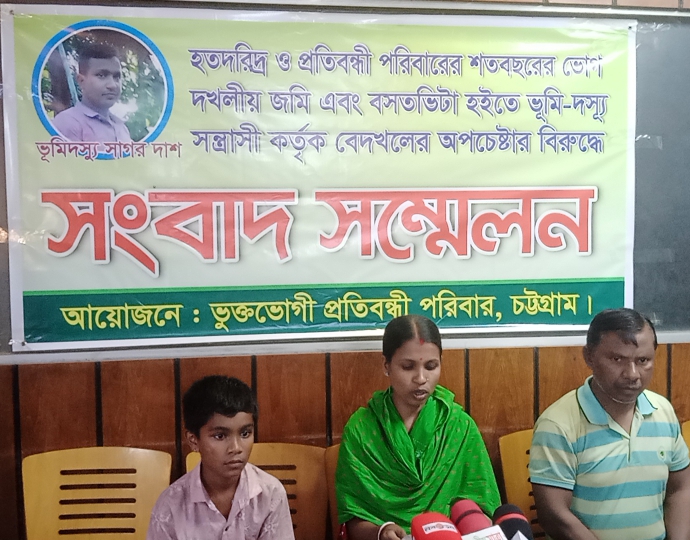 রাউজান পৌরসভার ৫ নং ওয়ার্ড সুলতান পুরে বাক প্রতিবন্ধী পরিবারের বসতবাড়ি ভূমিদস্যু ও সন্ত্রাসী কর্তৃক বেদখলের অপচেষ্টার বিরুদ্ধে আজ রাতে (২৬ অক্টোবর, রোববার), নগরীর একটি রেস্টুরেন্টে সংবাদ সম্মেলন করেছে ভুক্তভোগী মিঠন কুমার দাশের পরিবারের সদস্যরা। লিখিত বক্তব্যে অভিযোগ করে মিঠন কুমার দাশের পক্ষে তার স্ত্রী বলেন, শত বছরের পুরনো একটি সনাতন ধর্মাবলম্বীদের বৃহত বসত ভিটা ভূমিদস্যু সাগর দাশ ,সজল দাশ, উজ্জ্বল দাশ সর্বপিতা মৃত হারাধন দাশ,সাং - তেউড়ি বাড়ি,ছিটিয়া পাড়া, দক্ষিণ সুলতান পুর, রাউজান সহ আরো ১০/১২ সন্ত্রাসী সদস্য ও ভূমিদস্যু চক্রের লোকজন মিলে বাক প্রতিবন্ধী পরিবারের বসতবাড়ি দখল নিতে মরিয়া হয়ে উঠেছে।
