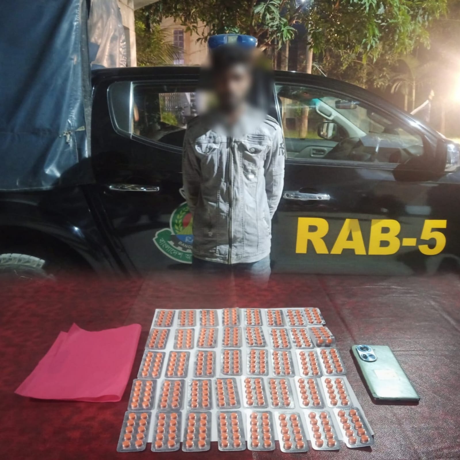 এরই ধারাবাহিকতায় ইং ১৩ নভেম্বর ২০২৫ তারিখ বিকাল-১৭.৩০ ঘটিকায় রাজশাহী জেলার চারঘাট থানাধীন হলিদাগাছী বাজার নামক এলাকায় অভিযান পরিচালনা করে মাদক ব্যবসায়ী ১। মোঃ মিজান আলী (২৪), পিতা-মোঃ রেজাউল করিম, সাং-টাঙ্গন, থানা-কাটাখালী, রাজশাহী মহানগর কে গ্রেফতার করে এবং জব্দকৃত আলামত অবৈধ মাদকদ্রব্য ট্যাপেন্টাডল ট্যাবলেট-৪০০ পিচ ও মোবাইল-০১ টি উদ্ধার করে। গোপন সংবাদের ভিত্তিতে র্যাব-৫, সিপিএসসি এর একটি আভিযানিক দল জানতে পারে যে, রাজশাহী জেলার চারঘাট থানাধীন হলিদাগাছী বাজার নামক এলাকায় ০১ জন মাদক ব্যবসায়ী অবৈধ মাদকদ্রব্য মজুদ করিয়া বিক্রয়ের উদ্দেশ্যে অবস্থান করছে। পরবর্তীতে র্যাবের গোয়েন্দা দল উক্ত আসামির গতিবিধি পর্যবেক্ষন করে এবং অদ্য তারিখ একটি আভিযানিক দল উক্ত এলাকায় অভিযান পরিচালনা করে ০১ জন মাদক ব্যবসায়ীকে গ্রেফতার করে এবং তার নিকট থাকা শপিং ব্যাগ তল্লাশী করে মোট ৪০০ পিচ অবৈধ মাদবাদ্রব্য ট্যাপেন্টাডল ট্যাবলেট উদ্ধার করে। ধৃত আসামি এলাকার চিহ্নিত মাদক চক্রের সদস্য। সে দীর্ঘদিন যাবত নিজ পেশার আড়ালে অবৈধ মাদকদ্রব্য ইয়াবা ট্যাবলেট, ট্যাপেন্টাডল ট্যাবলেট, গাঁজা, ফেন্সিডিলসহ বিভিন্ন ধরণের মাদক সীমান্তবর্তী অজ্ঞাত স্থান হতে সংগ্রহ করে রাজশাহী জেলার বিভিন্ন এলাকায় খুচরা ও পাইকারী ভাবে বিভিন্ন মাদক ব্যবসায়ী ও মাদকসেবীদের নিকট বিক্রয় করে আসছিল। মাদক কারবারী চক্রের অন্যান্য সদস্যদের ধরতে ব্যাব-৫. সিপিএসসি, রাজশাহী ক্যাম্পের গোয়েন্দা কার্যক্রম অব্যাহত থাকবে। উক্ত আসামির বিরুদ্ধে রাজশাহী জেলার চারঘাট থানায় মাদক আইনে একটি নিয়মিত মামলা রুস্ত করা হয়েছে। এই সময় উপস্থিত ছিলেন প্রেস ও ইলেকট্রনিক মিডিয়ার সাংবাদিকবৃন্দরা।