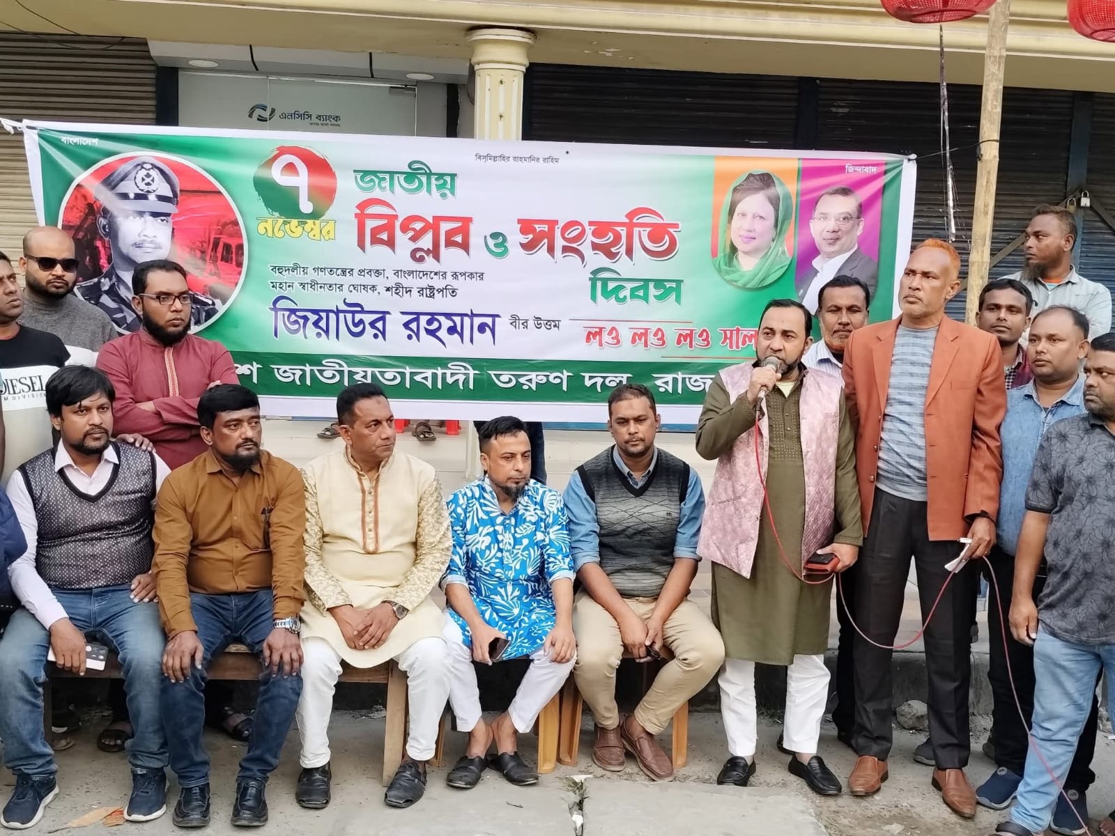 আলোচনা সভার পর আলুপট্টি মোড় থেকে একটি বর্ণাঢ্য শোভাযাত্রা বের করা হয়শোভাযাত্রাটি নগরীর বিভিন্ন সড়ক প্রদক্ষিণ করে বোয়ালিয়া মোড়ে জেলা তরুণ দলের কার্যালয়ের সামনে শেষ হয়স্লোগানব্যানারফেস্টুন ও তরুণ নেতাকর্মীদের উপস্থিতিতে পুরো এলাকা উৎসবমুখর হয়ে ওঠেশোভাযাত্রা শেষে সমাপনী বক্তব্য দেন জেলা শ্রমিক দলের সভাপতি রুকুনুজ্জামান আলমতিনি বলেন*** ৭ নভেম্বরের চেতনা আমাদের শক্তি জোগায়* দেশের শ্রমজীবী মানুষের অধিকার প্রতিষ্ঠায় এই চেতনা আজও সমান প্রাসঙ্গিকআলোচনা সভায় সভাপতিত্ব করেন জাতীয়তাবাদী তরুণ দল রাজশাহী জেলা শাখার সভাপতি গোলাম মোর্তুজা মাসুমতিনি বলেনদেশের যুবসমাজ আজ পরিবর্তনের পক্ষে সোচ্চারগণতন্ত্র* ভোটাধিকারের সুরক্ষা ও রাজনৈতিক স্বাধীনতা প্রতিষ্ঠায় তরুণদের ভূমিকা সবচেয়ে গুরুত্বপূর্ণপুঠিয়া উপজেলা বিএনপির যুগ্ম আহ্বায়ক জিল্লুর রহমানের সঞ্চালনায় বক্তব্য রাখেনরাজশাহী বিভাগের তরুণ দলের সাংগঠনিক সম্পাদক সাহিফুল ইসলাম সুমন ও জেলা তরুণ দলের সাংগঠনিক সম্পাদক মানাজির আহসান* দপ্তর সম্পাদক হাতেম আলী***নওহাটা পৌর তরুণ দলের সভাপতি সোহেল রানা।