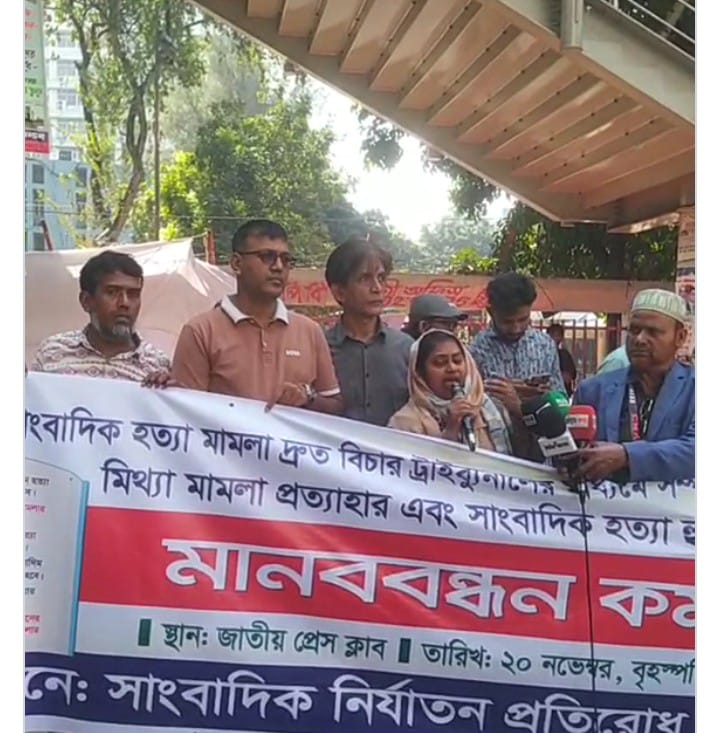 ২০ শে নভেম্বর ২০২৫ ইং সকালে শাহাবাগ চত্বরের এবং জাতীয় প্রেসক্লাবের সামনে পেশাগত দায়িত্ব পালনে ও দূর্নীতির বিরুদ্ধে তথ্য উদ্ঘাটন করতে যাওয়া সাংবাদিকদের নির্যাতন জেল-জুলুমের বিরুদ্ধে বাংলাদেশ প্রেস ক্লাবের আয়োজনে অনুষ্ঠিত হয় প্রতিবাদ ও মানববন্ধন কর্মসূচি।