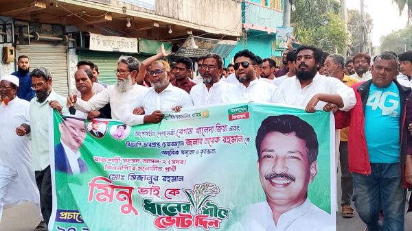 সজিব নিজস্ব প্রতিবেদক ঃ ২৪ নম্বর ওয়ার্ড কর্তৃক আয়োজিত রাজশাহী সদর ২ আসনের ধানের শীষের মনোনীত প্রার্থী জনাব মিজানুর রহমান মিনু ভাইয়ের ধানের শীষের প্রচার মিছিল । মিছিলে উপস্থিত